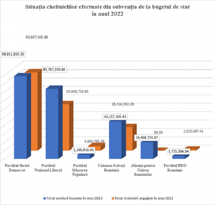 Potrivit acestui document, cele 6 partide care au dreptul de a primi subvenții de la bugetul de stat au beneficiat în 2022 de 256 milioane de lei (aprox. 51,2 milioane euro) subvenții